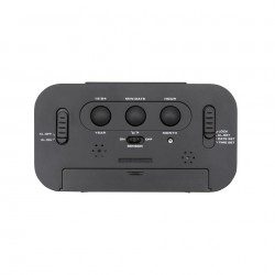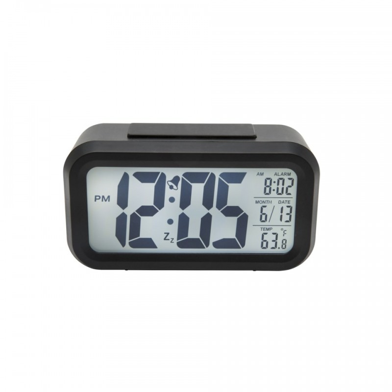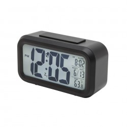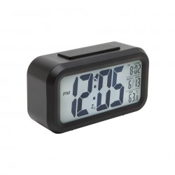 Väckarklocka med alarm, stor belyst display, termometer och snooze-funktion. Displayen visar tid, inställt alarm, datum och temperatur. Displayen kan automatisk tändas när det blir mörkt i omgivningen. Drivs med 3x AAA-batterier (medföljer ej). Mått: 134x44x75 mm.